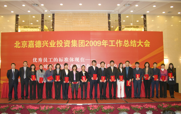 嘉德投资集团2009年度工作总结大会,2010年2月10日9:00在南宫温泉度假酒店召开。总结大会的主题围绕着集团在2009年取得的成绩和2010年的工作方向进行深入的分析与设想。在总结大会上各项目公司老总分别发言,向集团全体员工汇报2009年的工作和2010年的发展目标。最后由集团董事长黄晓华、总裁郑慧红做出总结性的发言,深入的剖析了集团的现状,并对日后的发展做出了明确的指导。